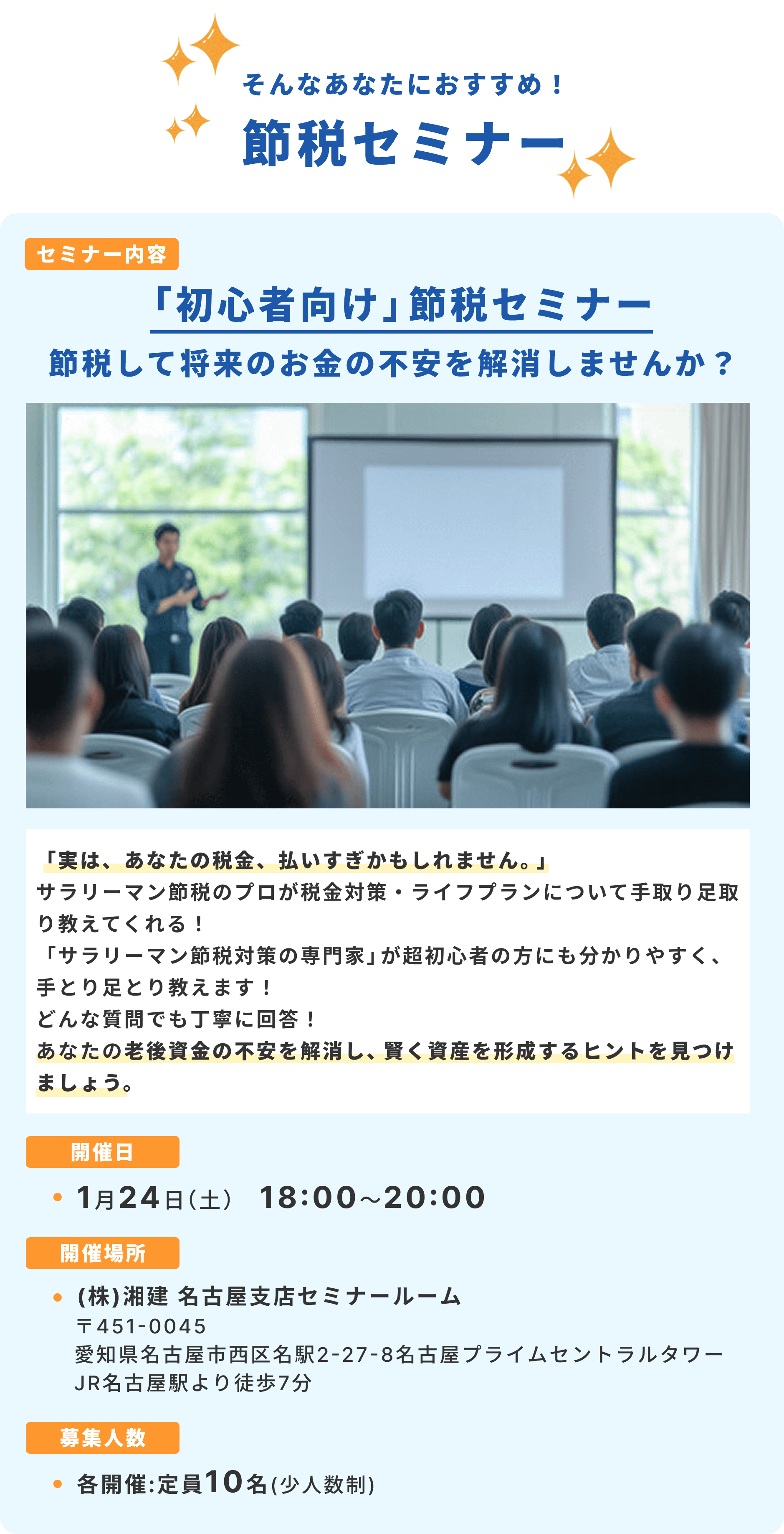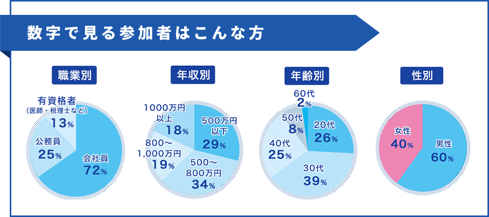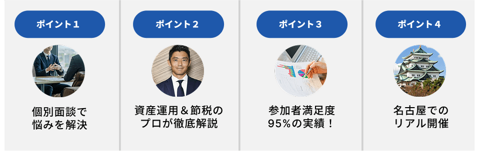 - ※セミナー後の個別面談では、ご質問への回答にご協力をお願いいたします。ご協力いただけない場合は、再度面談を実施させていただく事で個別面談の完了とさせていただきます。