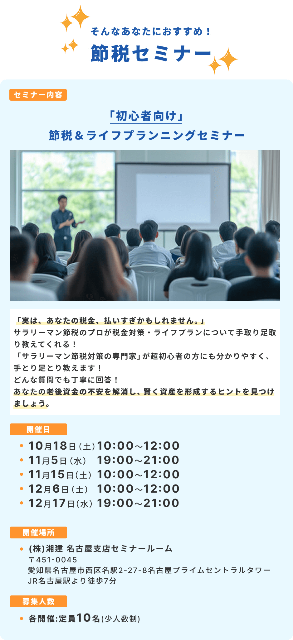 - ①セミナー実施後に個別面談を実施させていただくこと(なお、セミナーを受講されたご本人様のみ対象とさせて頂きます。)
